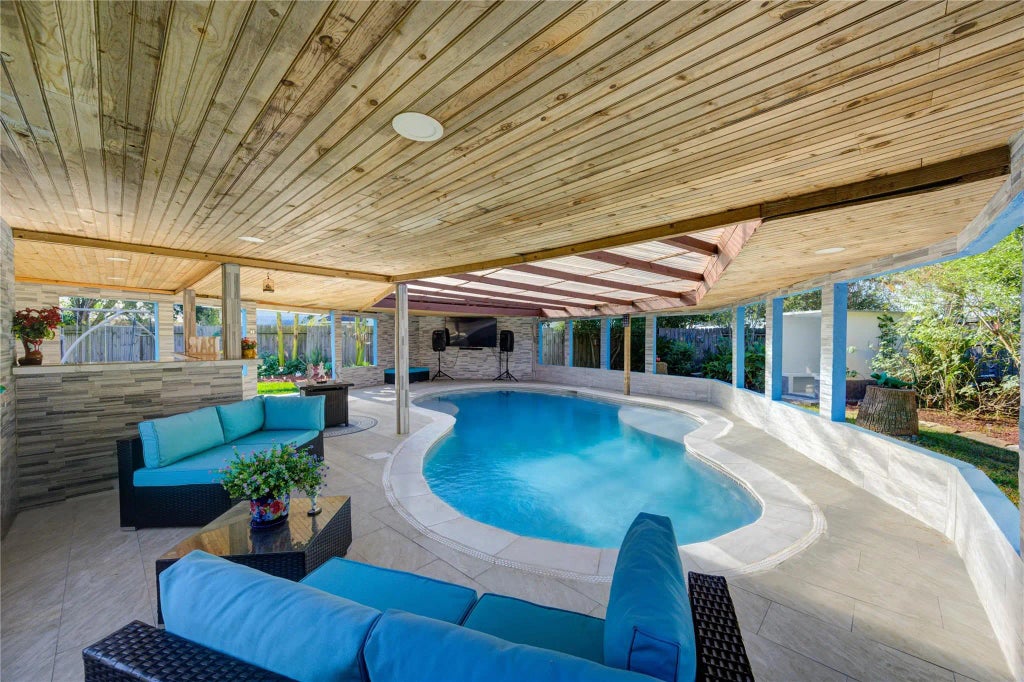 Welcome to Meadows of Parkway Lakes! This beautifully maintained 4-bedroom, 2.5-bath home boasts thoughtful updates including a 2023 roof, solar panels (paid off at closing), and recent upgrades like a 2019 fence, 2018 water softener, and 2017 water heater. The garage features epoxy floors and a new door motor. Inside, enjoy double-paned windows and included LG fridge, washer/dryer, plus a wine cooler by the pool. Step outside to your private backyard retreat with an inground pool, covered pool house with bar, casita bathroom, and two storage sheds—all included. A kids' playset adds fun for the whole family. The outdoor shower is ready for plumbing, making this space perfect for entertaining or relaxing. A unique opportunity in a fantastic location with low tax rate and easy access to Grand Parkway and Westpark. Don't miss this well-cared-for home with modern upgrades and incredible outdoor living!