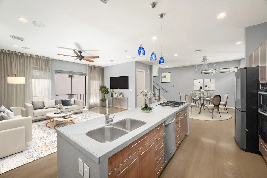 Welcome to 2310 Camden – a modern 3-story residence designed for both comfort and style. Enjoy your own private rooftop terrace with skyline views, perfect for entertaining or unwinding. The open-concept second floor features light wood flooring, balcony access, and a chef’s kitchen with sleek European cabinetry, quartz counters, stainless steel appliances, and a large island. A versatile first-floor bedroom with Murphy bed/desk system adds flexibility, while the primary suite offers dual vanities and a spa-inspired bath. Move-in ready with epoxy-coated 2-car garage, refrigerator, washer, and dryer included — all with no HOA fees. Ideally located minutes from the Medical Center, Museum District, and nearby parks.