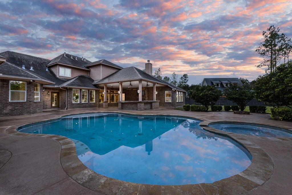 Secluded in the peaceful Benders Landing Estates, this remarkable home offers a tranquil escape with a private pool and large covered patio featuring a cozy fireplace and dedicated outdoor grill area. This home is well suited for extended family, or adult children. The attached guest suite, and detached converted garage offer generous space and ample privacy for hosting overnight guests. High ceilings and large game rooms provide tons of space for hobbies and guests. A whole home generator ensures safety and comfort during power outages. The property also boasts beautiful views from its spacious backyard. Never flooded. Truly a retreat from the hustle and bustle of everyday life.
