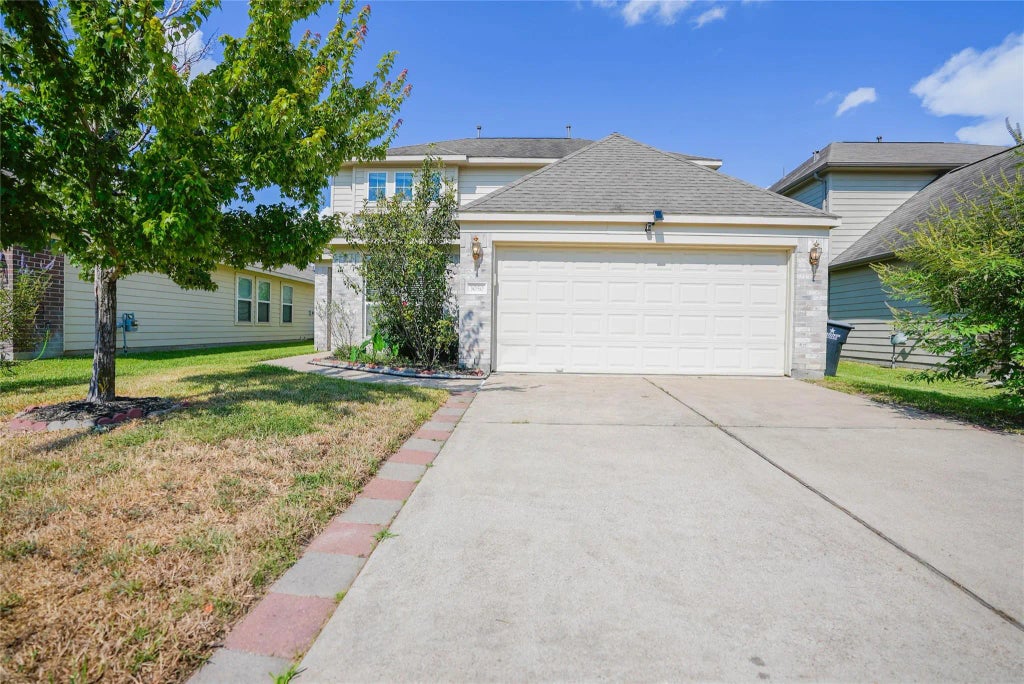 Two-story single-family home featuring 5 bedrooms, 3 full bathrooms, and a 2-car attached garage. The home offers an open-concept living and kitchen area, a formal dining room, and a spacious upstairs gameroom. The primary bedroom is located on the first floor with a double-sink vanity, separate shower, and soaking tub. Secondary bedroom also downstairs. Upstairs includes three additional bedrooms and a full bath. Exterior features include a brick and cement board facade, concrete driveway, and a fully fenced backyard.