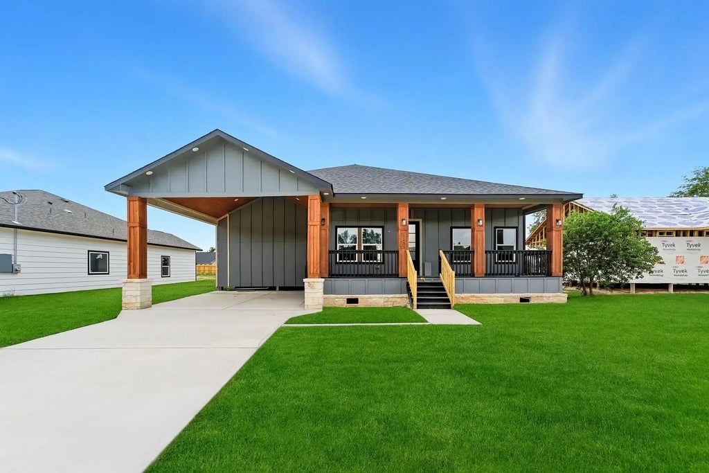 Stunning single-story farmhouse style home featuring 5 spacious bedrooms and 2 beautifully appointed bathrooms. This property sits on a generous 14,000 sq. ft. lot with no HOA, no restrictions, and a low tax rate. From the moment you arrive, you’ll fall in love with the large front and back porches—perfect for enjoying your morning coffee or evening sunsets. Inside, modern finishes blend seamlessly with timeless charm. The expansive kitchen offers ample cabinets and storage, while the living room and primary bedroom boast soaring cathedral ceilings that create a bright and open feel. Both bathrooms are designed with high-end finishes, delivering a true spa-like experience. This home combines size, style, and function, offering plenty of indoor and outdoor space for comfortable living. A true must-see, perfect for those who want farmhouse charm with a modern touch!