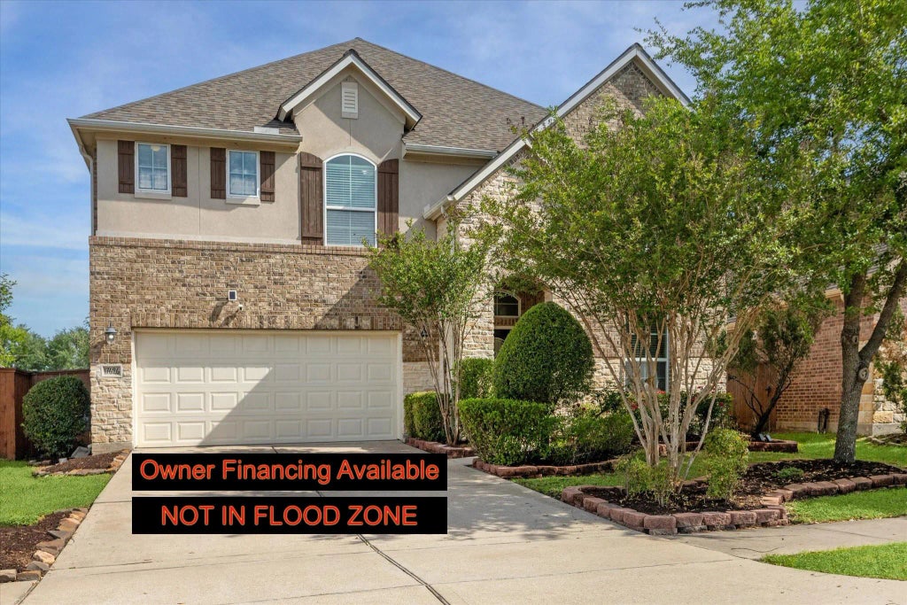 NOT in a Flood Zone! 2 Bedrooms Downstairs & 2 Bedroom Upstairs! Located on a quiet cul-de-sac with no back neighbors, this elegant 4-bedroom, 3-bath residence boasts a striking brick exterior with stone accents and high ceilings throughout. Step inside to a bright, inviting entry that flows into a formal dining room and spacious kitchen with ample cabinetry. The large office offers a spacious work environment. Enjoy a cozy family room with a central fireplace overlooking a covered patio w/ a bench swing, and a lush greenbelt surrounding a tranquil pond just beyond your backyard. Aliana offers award-winning clubhouses, two swimming pools, tennis courts, parks, and scenic jogging trails—all designed to enhance your lifestyle. FRESHLY PAINTED, BRAND NEW CARPET, COMPLETE SPRINKLER SYSTEM, & TANKLESS WATER HEATER! Schedule your tour today! Seller offering — at closing for updates or improvements!!