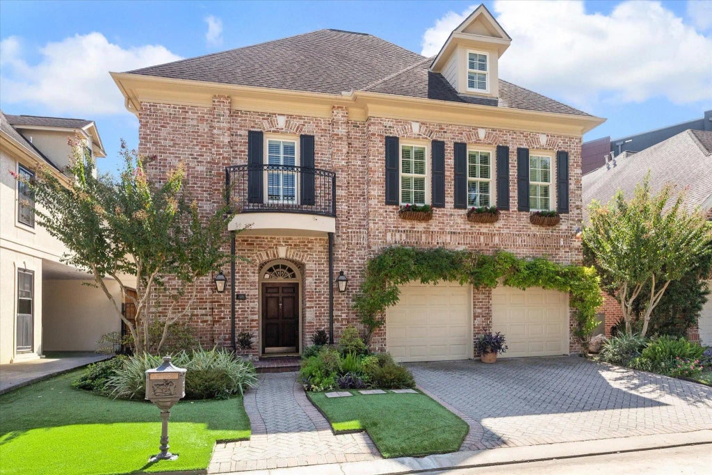 On the edge of Tanglewood, find this spacious traditional home in the gated community of Prestwick Court. Gas lanterns greet you at the entrance. Lovely three bedrooms, 3.5 baths + pool. Freshly painted 2025. Enjoy formal Living Room with fireplace, mantel and built-ins, formal Dining Room with lovely wainscoting. Relax in the Family Room with a second fireplace, adjacent to the Kitchen & casual dining area. The second floor features the Primary Bedroom with coffered ceiling and his & her separate closets and large bathroom, an additional flex space for office/exercise area. There is also a secondary bedroom with bathroom en suite, and a nice laundry room w/ sink, & built-in ironing board. The third floor has the third bedroom and en-suite bathroom. Elevator to two floors. Hardwood floors grace the first floor. Laminate wood in Primary room. Carpet in other bedrooms upstairs. A wonderful pool and hot tub enhance the fenced back yard. Sprinkler system. No signs allowed in complex.