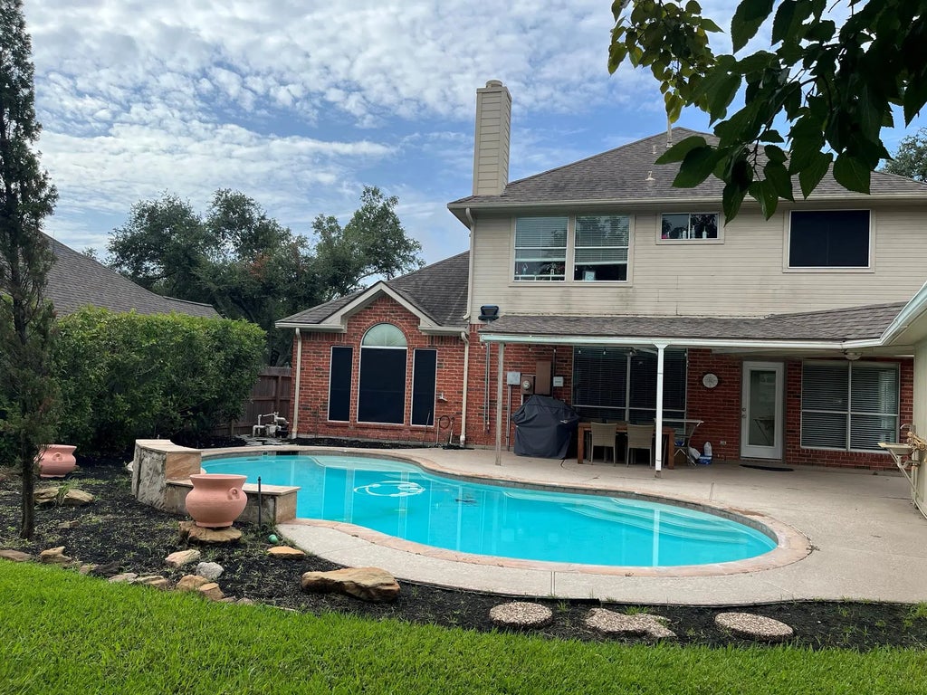 Beautifull two story 4 big bedrooms, 2 1/2 baths big upstairs gameroom, Office/ dinning room with french doors,house with lots of amenities, including gunite pool with large covered porch, double driveway exstends all the way to the detached garage with easy access to the back door, iron feneced gated driveway , granite tops, separate shower in master bedroom and much more.