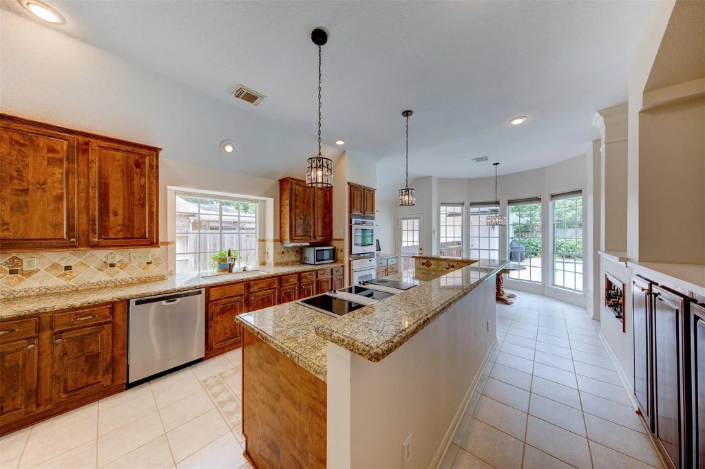 Classic style & elegance await in this popular David Weekley 1-story plan! Striking architectural curves & angles are stunning amid walls of windows & tall ceilings. A grand entry is bordered by an executive study adorned with glass front bookcases & French doors on one side & a bright formal dining room on the other. 4 bedrooms split 2/2 on the front & back of the home provide optimum privacy. The Texas-sized primary bedroom has a relaxing sitting area overlooking the backyard. The spa-inspired en-suite bath has a jacuzzi tub, separate shower, double sinks, & a HUGE walk in closet. The remodeled kitchen is a chef's dream with gleaming granite countertops, double ovens, Jenn-Air island cooktop, new trendy light fixtures, wine rack, & SO MUCH STORAGE SPACE! The tranquil backyard is designed for relaxing with a sparkling pool, quaint stone path, & lush foliage including a blackberry bush! The premium location within the neighborhood is close to parks,pool,& tennis courts.2 new A/C units.