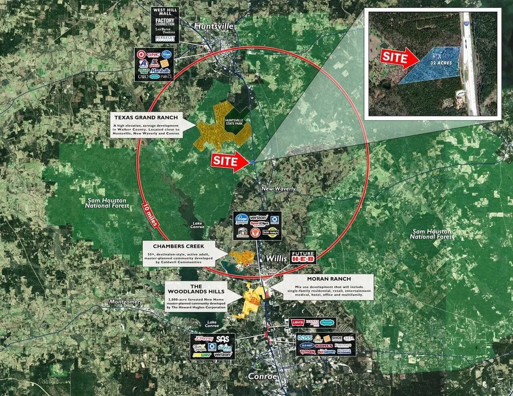 NEW PRICE POSITION!! 31.94 AC/W 920' FRONTAGE ON IH-45 WITH THE NEW SB EXIT RAMP AT THE PROPERTY. PRIVATE USE OF OLD FEEDER RD.JUST NORTH OF WILLIS WHICH IS EXPERIENCING HUGE GROWTH.WELL POSITIONED BETWEEN THE WOODLANDS/CONROE/HUNTSVILLE/NEW WAVERLY & LAKE CONROE.JUST NORTH OF EXXON/MOBILE CORP HEADQUARTERS. ADJACENT TO TEXAS GRAND RANCH,THE WOODLAND HILLS A MASTER PLANNED COMMUNITY OF APPROX 4,600 HOMES(HOWARD HUGHES CORP),MORAN RANCH MASTER PLANNED COMMUNITY,CHAMBERS CREEK(55+ RES. COMMUNITY)DEVELOPMENTS IN DIFFERENT STAGES OF DELIVERY.SURROUNDED BY SAM HOUSTON NATIONAL FOREST & LAKE CONROE.USES ARE UNLIMITED/LUXURY RV PARK,RETAIL,CORP RETREAT,SFR,MULTI-FAMILY,OR INDUSTRIAL.PROPERTY IS COMPLETLY FENCED W/WROUGHT IRON FENCE/GATE.WINDING CONCRETE DRIVE LEADS TO (2 HOMES TO BE MOVED)ALL LOOKING ACROSS A STOCKED POND W/BRIDGE TO A ISLAND GAZEBO.4,800 SF BUILDING.NO FLOODPLAIN PER CURRENT FEMA/FIRM MAPS & A RECENT CAT 1A CONDITION ll SURVEY. PROPERTY IS AGG EXEMPT. POSSIBLE OWNER TERMS.