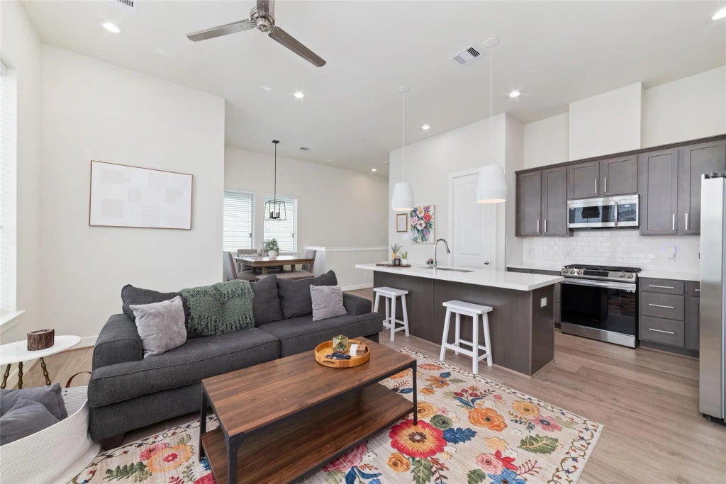 Masterfully crafted, this two-level residence blends sophisticated design with everyday comfort, all set within a private yard and just minutes from premier dining, shopping, and parks—plus access to nearby pickleball courts. Thoughtfully designed with natural light and openness, this home features 3 bedrooms and 2.5 baths across a smartly organized layout. The main level offers two spacious guest bedrooms with laminate flooring, a full bath, and a well-equipped utility room. Upstairs, the expansive Great Room boasts 11-foot ceilings, an island kitchen with premium appliances, and a window-wrapped dining area perfect for entertaining. The owner’s suite is a private retreat, complete with a walk-in closet featuring custom built-ins and a coffered soaring ceiling. The luxurious primary bath showcases a freestanding soaking tub, a frameless glass shower, and dual quartz-topped vanities finished with designer-selected fixtures. Washer, dryer, and fride included. Extra parking is available.