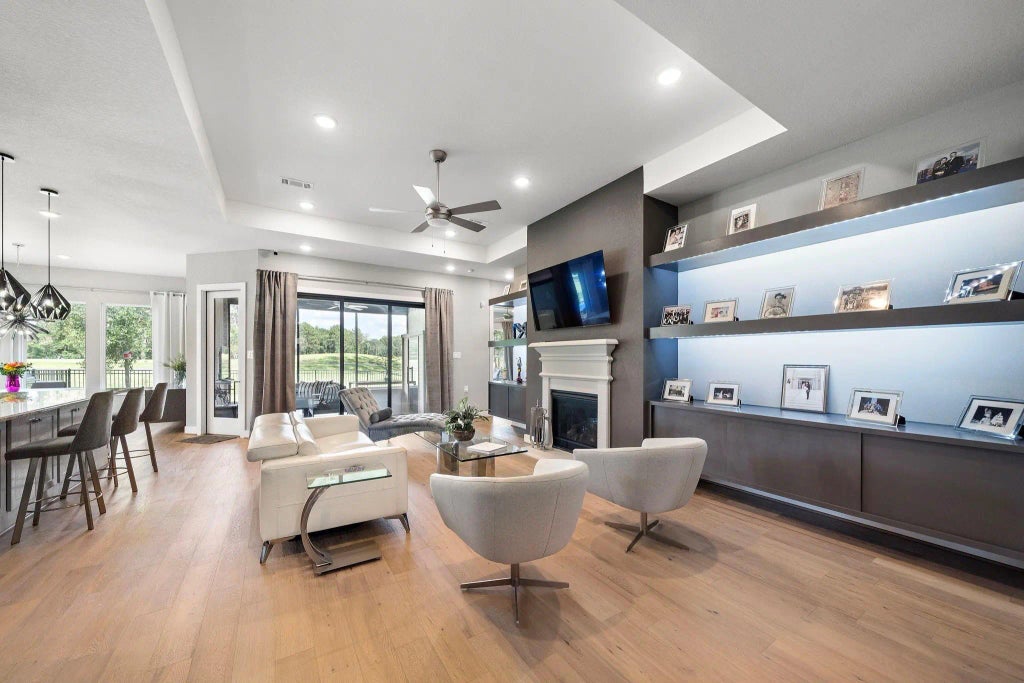 Skip the wait—this beautifully upgraded Caldwell Homes residence, featuring the same sought-after floor plan as the model home, is move-in ready! Nestled on the 13th hole of Highland Pines Golf Course in the Fairway Pines 55+ section of The Highlands’ prestigious Caldwell Development, this 3-bedroom + den, 2.5-bath home spans 2,694 sq ft with a 3-car garage. Designed for entertaining, the gourmet kitchen flows seamlessly to an extended covered patio through oversized sliding glass doors, offering sweeping golf course views and true indoor-outdoor living. Thoughtful upgrades include a gourmet kitchen, custom lighting, a fireplace, floating cabinets and shelves, and a screened, tiled patio. Step outside to enjoy brand-new pickleball courts and a modern clubhouse with a fitness center and social gathering spaces. Don’t miss this rare opportunity to own a move-in ready home in one of the area’s most vibrant active adult communities!