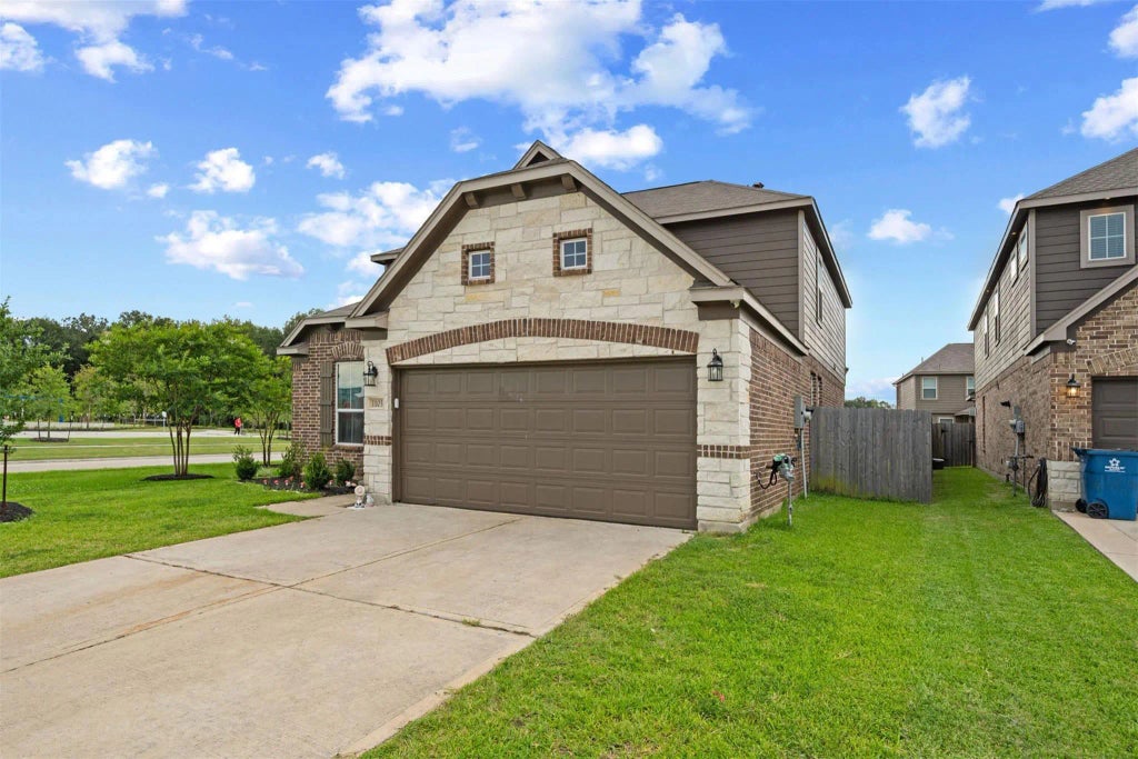 Lovely 2-story home on a corner, cul-de-sac lot featuring an excellent brick and stone curb appeal with a shaded front porch! The 1st floor offers wood-look tile flooring, a formal dining room, large living room, breakfast nook, kitchen with granite countertops, and a versatile bedroom with an adjacent full bath - perfect multi-purpose option! Upstairs holds the spacious game room, utility room, and 3 remaining bedrooms including the primary bedroom suite with a walk-in closet. The backyard offers a covered patio and plenty of green space to expand! This home is located across the street from the community park/playground area and with easy access to Hwy 90 and Beltway 8!
