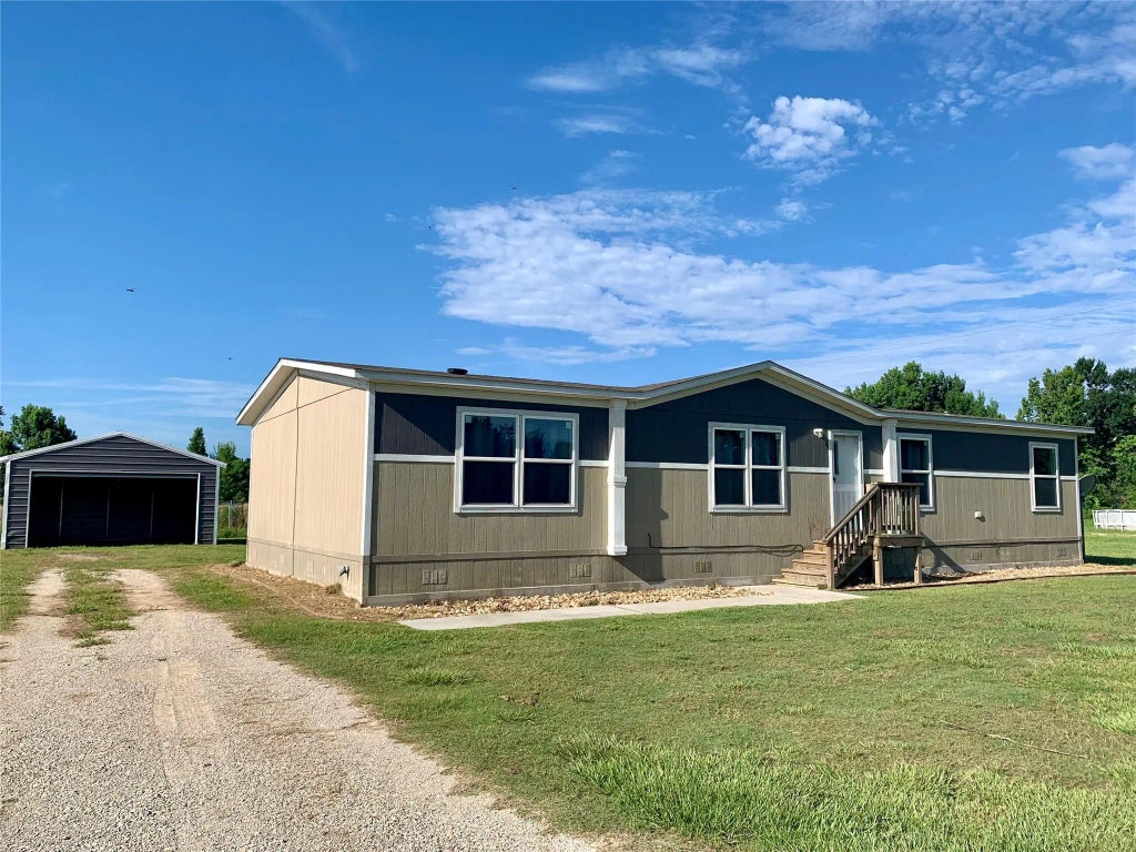 Enjoy the peace! Spacious 3 bedroom, 2 bath manufactured home situated on 1.25 acres of unrestricted land. The open floor plan features a generously sized living room and a family room which opens into the kitchen dining area. The Kitchen offers an island bar, plenty of cabinet space, with a large utility room. Large primary bedroom, large soaking tub, huge walk-in closet. The secondary bedrooms are substantial size with ample closet space. The secondary bath has tub/shower combo. Out back there is a 2 car garage where possibilities are endless to create covered patio, grilling area, firepit, etc. Call today to schedule a private showing!