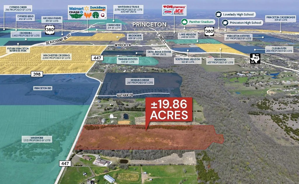 Prime ±19.86-acre tract at the southeast corner of CR 447 and Nathan Drive in Princeton’s ETJ. Minutes from US-380 and bordered by large master-planned communities, the property offers roughly ±15 net usable acres outside the floodplain and flowage easement. Utilities include a 48” wastewater line along the west side of CR 447 and a planned 12” water main connection. With no zoning restrictions and surrounded by significant single-family and multifamily growth, this site is an exceptional development opportunity in one of Collin County’s fastest-growing corridors.