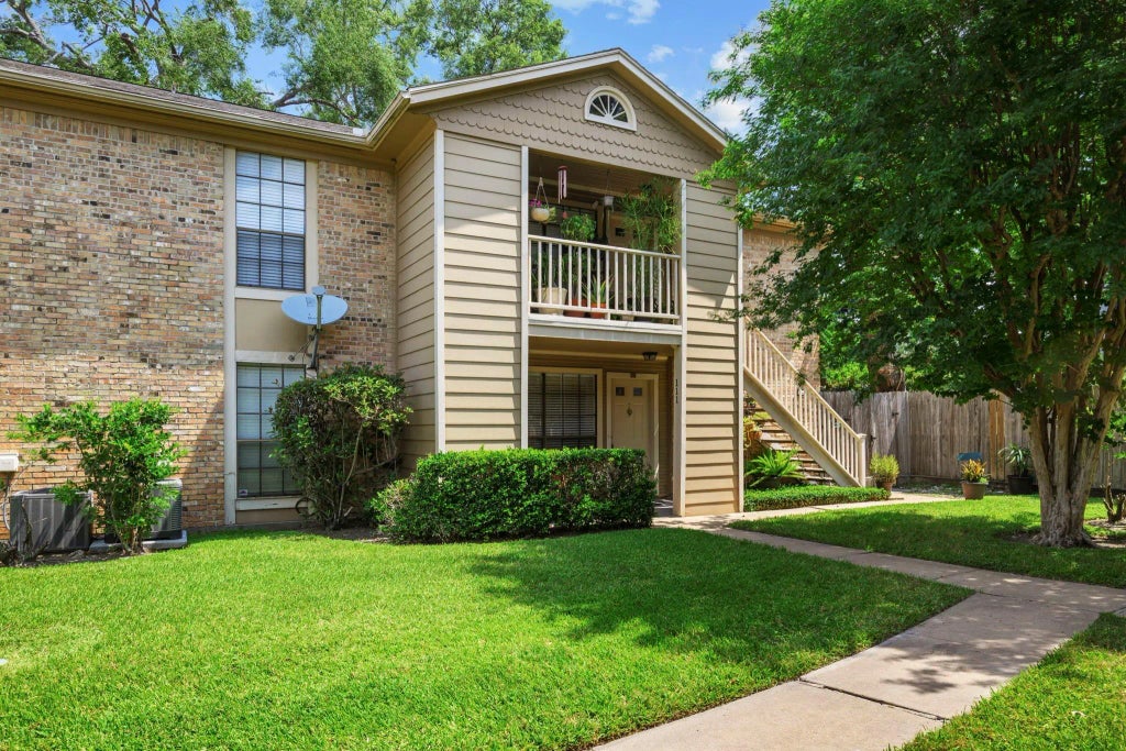 Perfect for roommates! This split floorplan offers privacy for both bedrooms as they are on opposite sides of the condo with shared areas in between. Unit is located on the lower level with private wood decked patio accessible through French doors from primary bedroom. The primary bedroom has walk-in closet and an ensuite bathroom which has a stackable washer and dryer combo. Secondary bedroom also has a walk-in closet and hall bathroom nearby. There are large windows to bring in natural light. Flooring is primarily vinyl plank. Countertops are granite in kitchen and primary bedroom. Stay cool with ceiling fans in living room and both bedrooms. Parking for condo unit is assigned with one spot covered and one uncovered. There is locked storage outside at the entry porch. Community has a pool and ample guest parking. Conveniently located with easy access to I-10 and Loop 610. Ready for a new adventure? Come see where it could begin.