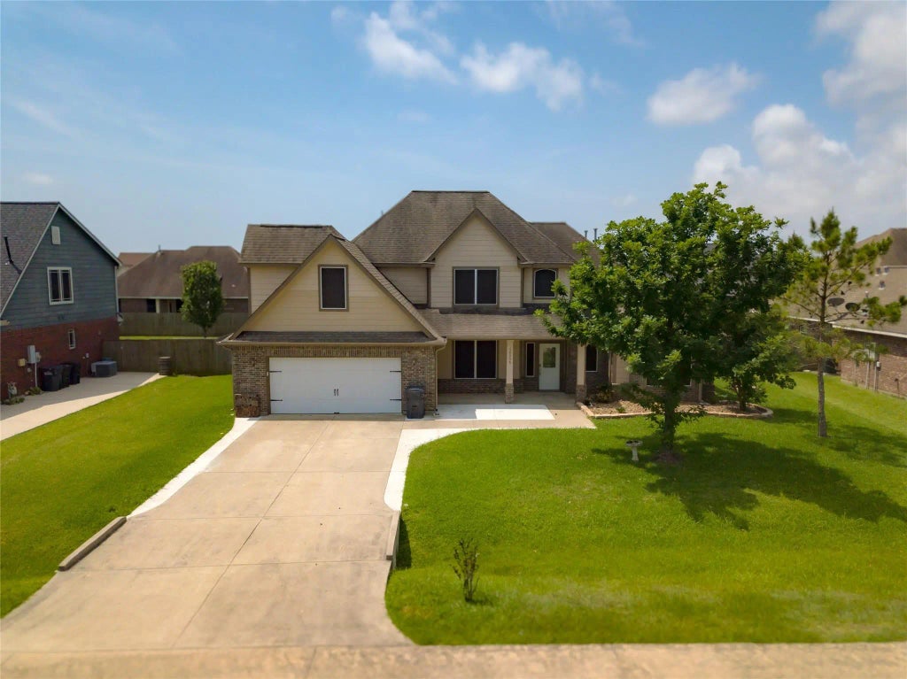 Nestled in the highly desirable Lakes of Champions Estates, this beautiful 2-story brick home sits on an oversized lot, offering both space and comfort. A welcoming atmosphere with a large living area highlighted by a cozy gas fireplace, ideal for those cool evenings. A gourmet kitchen that boasts a central island providing ample prep space and a perfect spot for gathering. The large primary downstairs bedroom offers privacy and convenience. The ensuite bath features dual vanities, a sizable shower, and an oversized closet. A second bedroom and full bath on the first floor can serve as a guest room or a private study. Two additional bedrooms upstairs share a full bathroom and a spacious game room, perfect for family fun and entertainment. The expansive backyard is highlighted by the newly added covered patio providing a great space for relaxation or hosting gatherings. Located in the highly-rated Barbers Hill ISD, this home offers both comfort and convenience in a prime neighborhood.