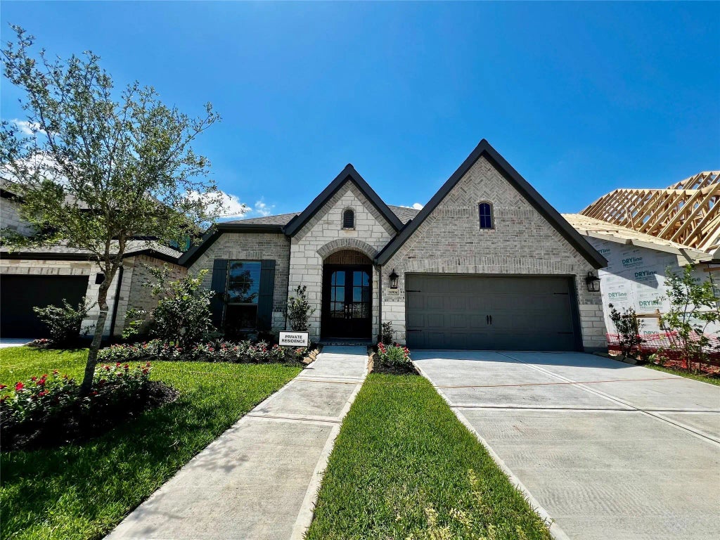 Home office with French doors set at entry with 12-foot coffered ceiling. Open kitchen features generous counter space, corner walk-in pantry and island with built-in seating space. Dining area flows into open family room with wall of windows. Primary suite includes bedroom with wall of windows. Dual vanities, corner garden tub, separate glass-enclosed shower and two walk-in closets in primary bath. A guest suite with private bath adds to this four-bedroom design. Covered backyard patio. Mud room off two-car garage.